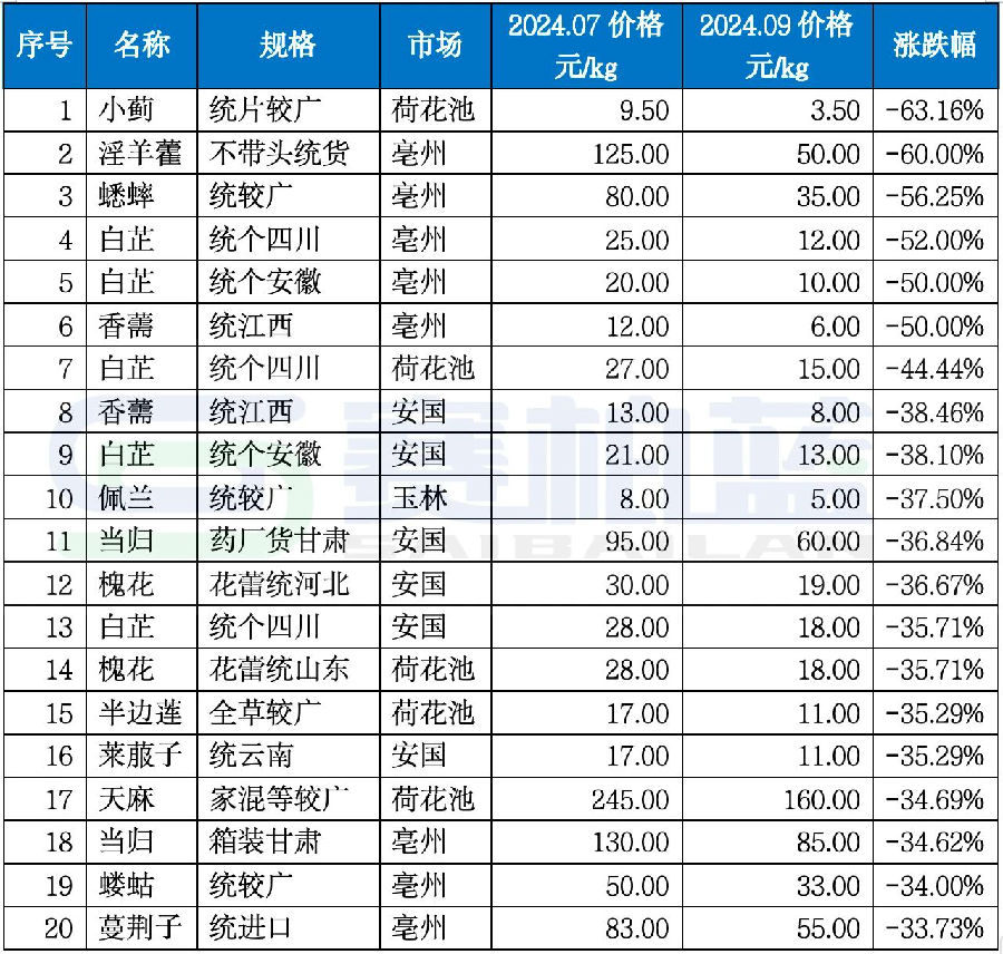 哪些中藥材跌幅最大?
