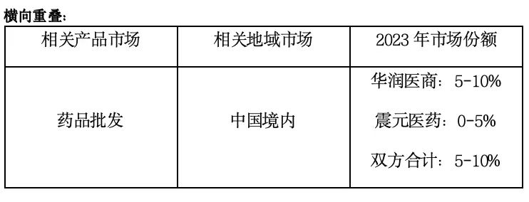 在相關(guān)產(chǎn)品市場的國內(nèi)藥品批發(fā)領(lǐng)域,華潤醫(yī)商在2023年的市場份額為5-10%,而震元醫(yī)藥市場份額為0-5%,雙方合計份額為5-10%。