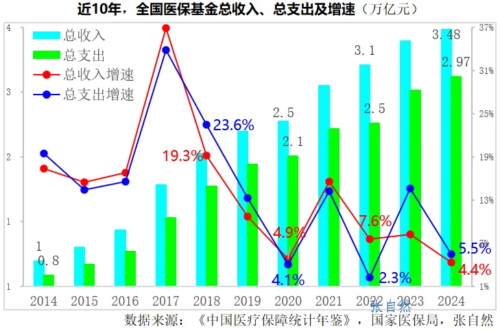 《快報(bào)》顯示,2024年,全國(guó)醫(yī)?;?strong style="-webkit-tap-highlight-color:transparent;margin:0px;padding:0px;outline:0px;max-width:100%;box-sizing:border-box !important;overflow-wrap:break-word !important;visibility:visible;">總收入34809.95億元,總支出29675.92億元,分別較上年增加4.4%、5.5%,支出增速與收入增速的協(xié)調(diào)性有所增強(qiáng),支出過快增長(zhǎng)的態(tài)勢(shì)有所遏制。其中,這個(gè)收入增速是多地支持企業(yè)減輕負(fù)擔(dān)、降低醫(yī)保費(fèi)率的背景下實(shí)現(xiàn)的,實(shí)現(xiàn)了基金收入穩(wěn)定與促進(jìn)經(jīng)濟(jì)恢復(fù)的統(tǒng)籌。