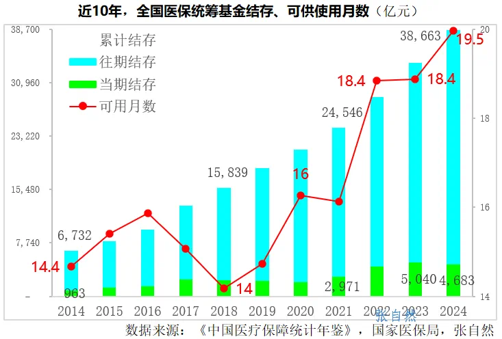 2024年,全國(guó)醫(yī)保統(tǒng)籌基金收入28507.29億元(其中,職工醫(yī)保統(tǒng)籌基金收入17368.93億元,居民醫(yī)?;鹗杖?1138.36億元)、統(tǒng)籌基金支出23824.42億元(其中,職工醫(yī)保統(tǒng)籌基金支出13205.04億元,居民醫(yī)?;鹬С?0619.38億元),當(dāng)期結(jié)存4682.87億元,累計(jì)結(jié)存38662.62億元,可供使用19.5個(gè)月,較上年增加了1.03個(gè)月,統(tǒng)籌基金的緩沖能力增強(qiáng)。