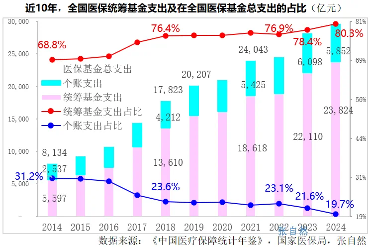 《快報(bào)》顯示,全國(guó)醫(yī)?;鹂傊С?9675.92億元,其中,統(tǒng)籌基金支出23824.42億元、個(gè)人賬戶支出5851.1億元,分別占了全國(guó)醫(yī)保基金總支出的80.3%、19.7%。統(tǒng)籌基金的占比較上年增加了2個(gè)百分點(diǎn),說明醫(yī)?;鸬墓矟?jì)效能進(jìn)一步增強(qiáng)。部分是因個(gè)賬記賬方式改革(將單位幫職工繳納的原計(jì)入職工個(gè)人賬戶的部分資金改為計(jì)入職工統(tǒng)籌賬戶)2023年全面落地所致。(詳見下圖)