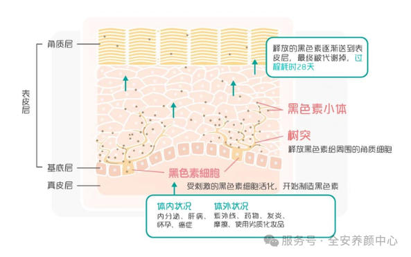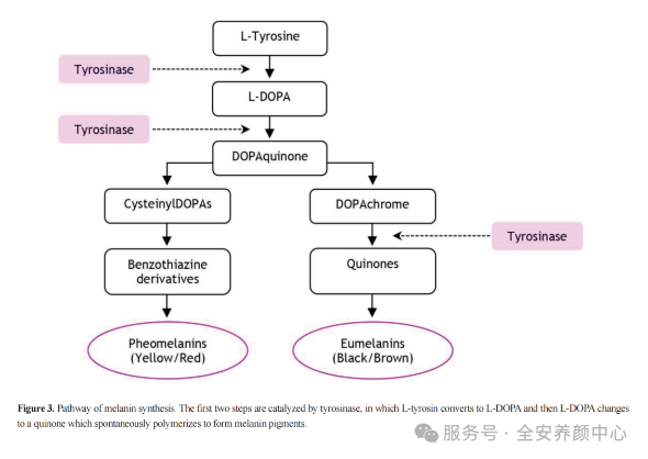 黑色素的生成是由紫外線照射—細(xì)胞分裂素( 內(nèi)皮素) —黑色素細(xì)胞受體—黑色素細(xì)胞急劇增殖( 激活) —酪氨酸酶:酪氨酸( 酪氨酸酶) —多巴—多巴醌—( 多巴醌互變酶、氨化酶) —黑色素小體。