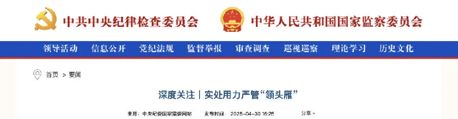 4月30日,中紀(jì)委在《深度關(guān)注丨實處用力嚴(yán)管“領(lǐng)頭雁”》中以廣東省廣州市紀(jì)委監(jiān)委的實踐為經(jīng)驗強調(diào)對“一把手”的監(jiān)管。