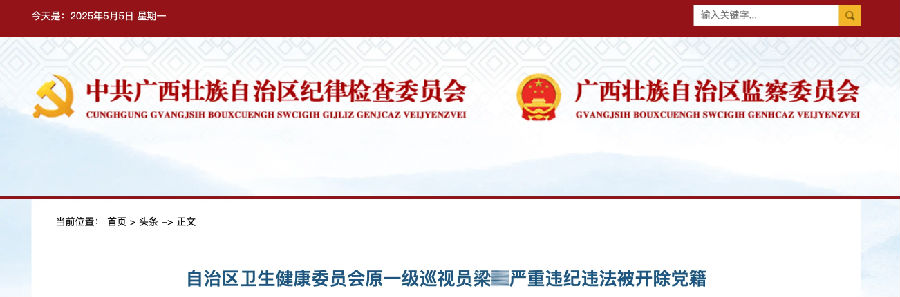 近日,廣西自治區(qū)紀(jì)檢委發(fā)布通報,廣西自治區(qū)衛(wèi)健委原一級巡視員梁某嚴(yán)重違紀(jì)違法被開除黨籍。