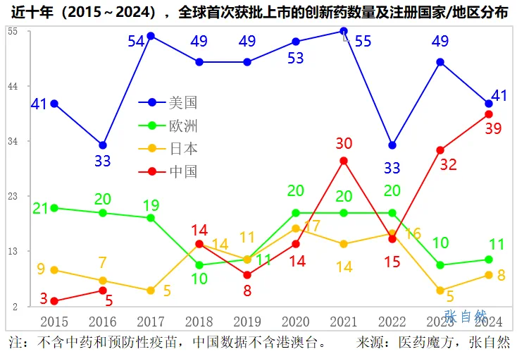 同期,美國批準的創(chuàng)新藥數(shù)量與其9年前的持平,仍是41個;歐洲較9年前近乎腰斬,由2015年的21個下降到了2024年的11個,由全球第2位下滑到第3位;2024年,日本批準了8個創(chuàng)新藥,較9年前2015年的還少了1個,全球排名由第3位下降到第4位。(詳見下圖)
