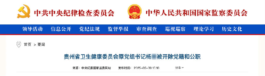 5月30日,貴州省紀(jì)委監(jiān)委發(fā)布消息,貴州省衛(wèi)健委原黨組書記楊某被開除黨籍和公職。通報指出,楊某在干部調(diào)動工作中為他人謀取利益并收受財物,違規(guī)收受禮金,不正確履行工作職責(zé),違規(guī)插手市場經(jīng)濟活動,將公權(quán)力當(dāng)作攫取私利的工具,大搞權(quán)錢交易,利用職務(wù)便利為他人謀取利益,并非法收受巨額財物等。