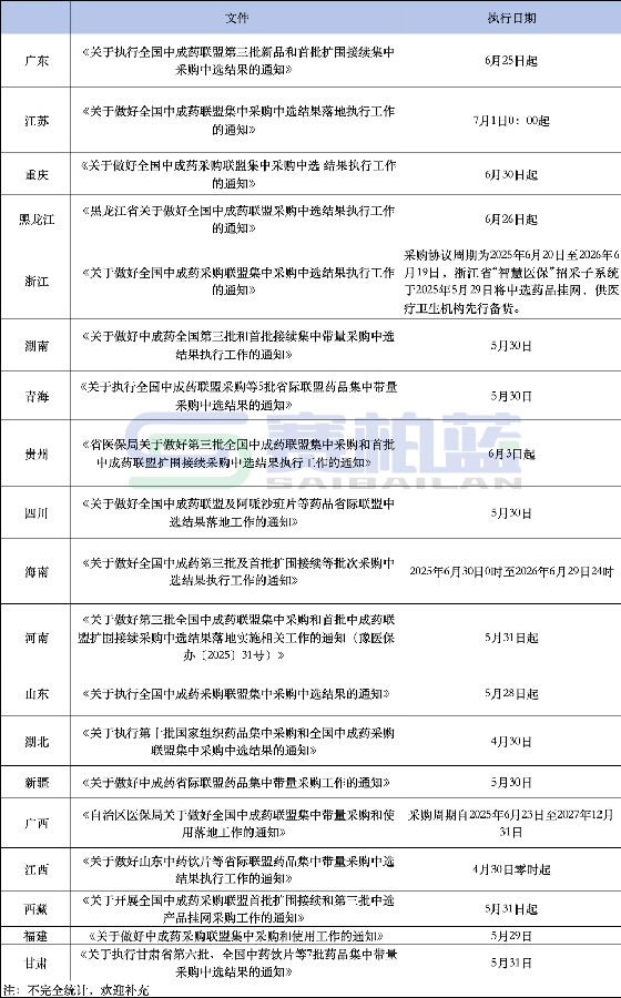 據(jù)賽柏藍(lán)梳理,目前至少已經(jīng)有19省/市/自治區(qū)發(fā)布全國中成藥聯(lián)盟第三批集采中選結(jié)果落地安排。