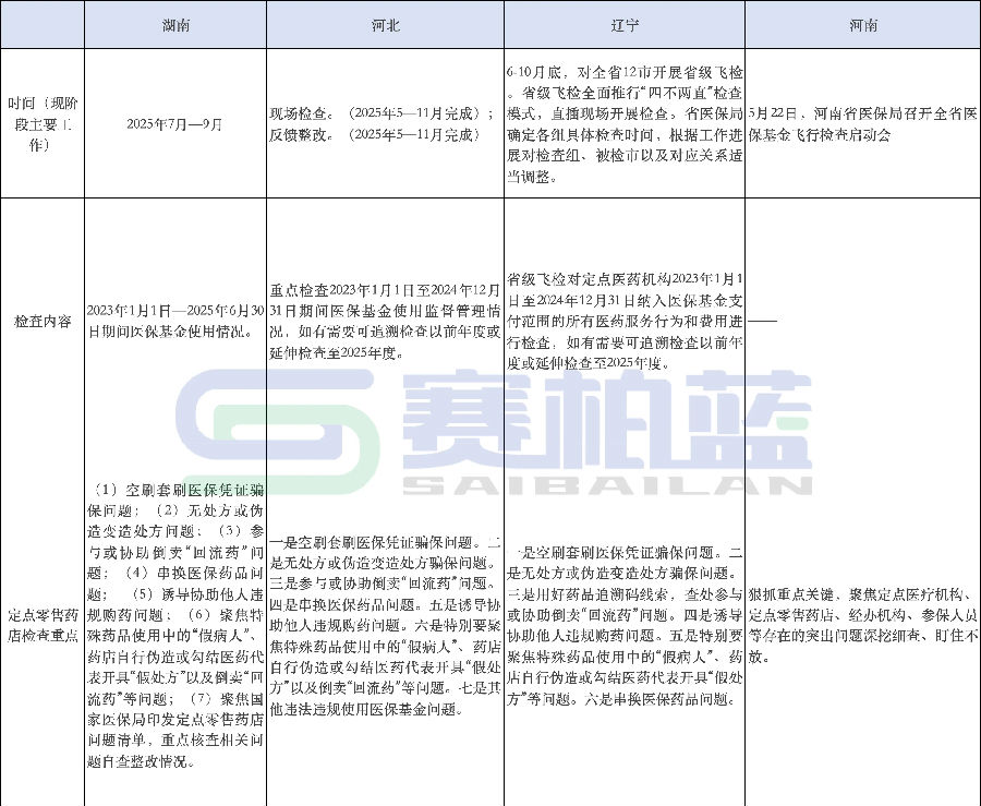 據(jù)賽柏藍(lán)不完全梳理發(fā)現(xiàn),截至目前,河北、遼寧、河南等多省也已啟動(dòng)省級(jí)醫(yī)保飛檢,定點(diǎn)零售藥店主要檢查重點(diǎn)如下: