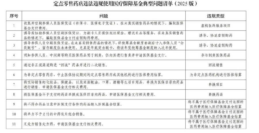 國(guó)家醫(yī)保局在開展2025年定點(diǎn)醫(yī)藥機(jī)構(gòu)違法違規(guī)使用醫(yī)保基金自查自糾工作中指出,定點(diǎn)零售藥店違法違規(guī)使用醫(yī)保基金典型問(wèn)題清單中,包括虛構(gòu)醫(yī)藥服務(wù)項(xiàng)目;誘導(dǎo)、協(xié)助虛假購(gòu)藥;回流銷售;串換項(xiàng)目;串換藥品;將不屬于醫(yī)?;鹬Ц斗秶尼t(yī)藥費(fèi)用納入醫(yī)保基金結(jié)算等多項(xiàng)違規(guī)類型。