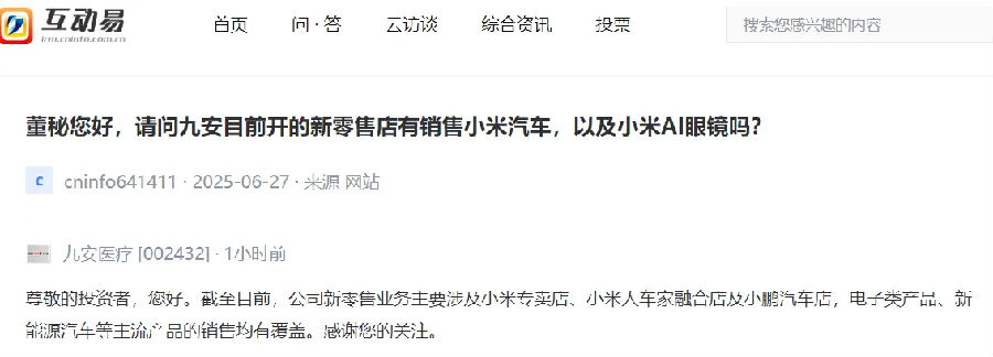 01 九安醫(yī)療跨界賣小米汽車 并非沖動決定 7月7日,九安醫(yī)療在互動平臺回答投資者提問時表示,公司新零售業(yè)務主要涉及小米專賣店、小米人車家融合店及小鵬汽車店,電子類產(chǎn)品、新能源汽車等主流產(chǎn)品的銷售均有覆蓋。 一個醫(yī)療器械公司去賣新能源汽車,如此布局難免被認為有“不務正業(yè)”之嫌。針對投資者關(guān)于“是不是不看好醫(yī)療相關(guān)業(yè)務的發(fā)展”的提問,九安醫(yī)療回應稱,持續(xù)看好家用醫(yī)療器械市場的長期未來前景,以及市場需求的穩(wěn)定性。 據(jù)悉,新零售業(yè)務板塊是九安醫(yī)療一個相對獨立的業(yè)務單元,由部門自主獨立決策,截至2024年末占營業(yè)收入比重為2.43%。 九安開賣新能源汽車并非臨時上馬的“蹭熱度”。早在2022年,九安醫(yī)療就接連購入了小鵬汽車、理想汽車和蔚來汽車的股票,合計投入資金約3.5億元。據(jù)2024年中報顯示,九安醫(yī)療又增加了特斯拉的投資。 近些年,為拓展新零售業(yè)務渠道,九安醫(yī)療又新設(shè)電子科技公司、汽車銷售服務有限公司等主體。換言之,在汽車銷售領(lǐng)域,九安醫(yī)療不是新秀,而是有深厚資本背景和完整銷售網(wǎng)絡的老兵。 02 10年合作 小米與九安和平分手 九安與小米的合作更是由來已久。 2014年,小米2500萬美元入股九安醫(yī)療iHealth,持股共計20%。依托小米“線下+線上”的新零售體系,彼時外貿(mào)見長的九安醫(yī)療,在2016-2017年實現(xiàn)了iHealth產(chǎn)品國內(nèi)收入占比快速躍升。 但隨著九安醫(yī)療業(yè)務重心轉(zhuǎn)移,以及小米健康生態(tài)自建能力增強,雙方的協(xié)同需求開始逐步下降。