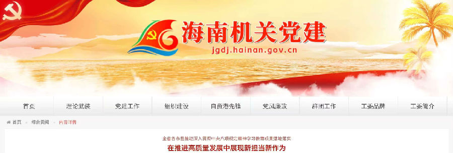 近日,海南機關(guān)黨建發(fā)布《全省各市縣推動深入貫徹中央八項規(guī)定精神學(xué)習(xí)教育成果落地落實在推進高質(zhì)量發(fā)展中展現(xiàn)新?lián)?dāng)新作為》。