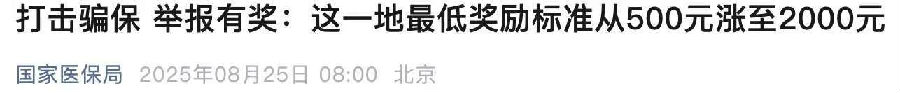 8月25日,國家醫(yī)保局轉(zhuǎn)發(fā)重慶日報文章,其中提到,違法違規(guī)使用醫(yī)?;鸬呐e報獎勵的最低標(biāo)準(zhǔn),由原來的不少于500元,提高到不少于2000元。